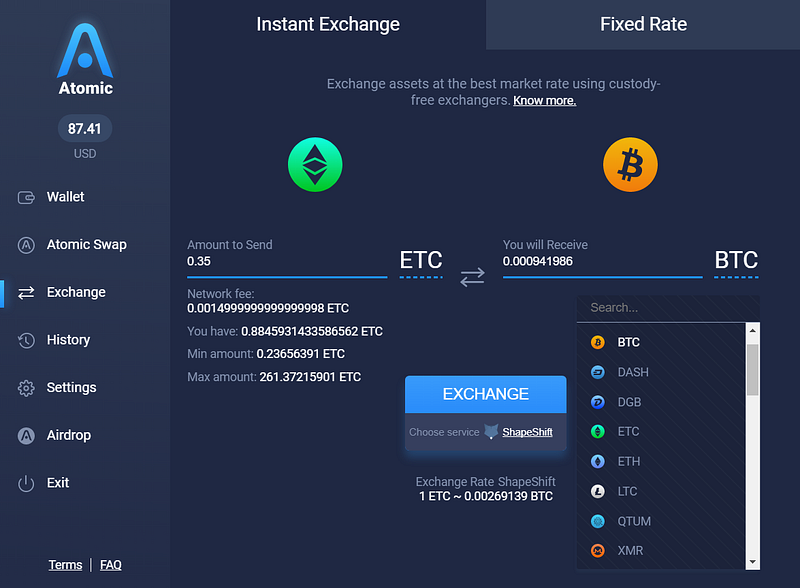Take a look how to Instant Exchange assets by ShapeShift right in the Atomic Wallet UI: